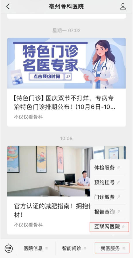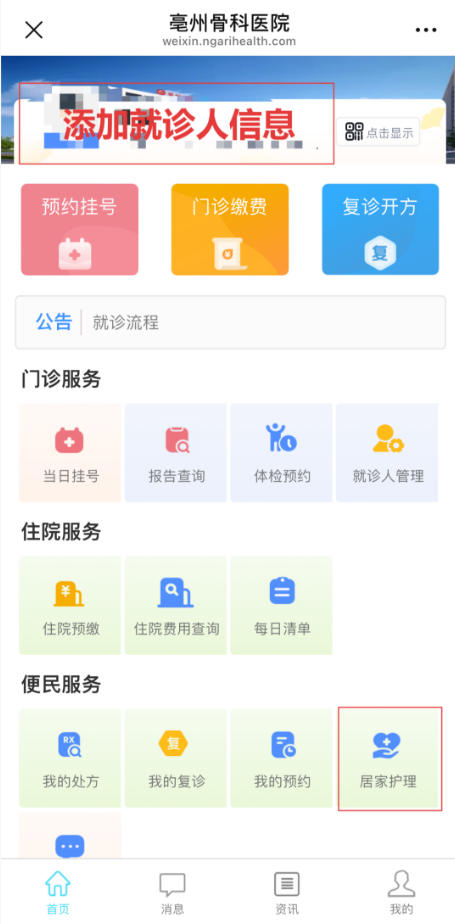 关注微信公众号“亳州骨科医院”后,点击“就医服务”→“互联网医院”→“居家护理”,选择所需服务,填写被服务人信息、地址,上传病历或就诊凭证,勾选阅读同意协议,支付成功即可等待护士上门!24小时急诊电话:0558-8880120。