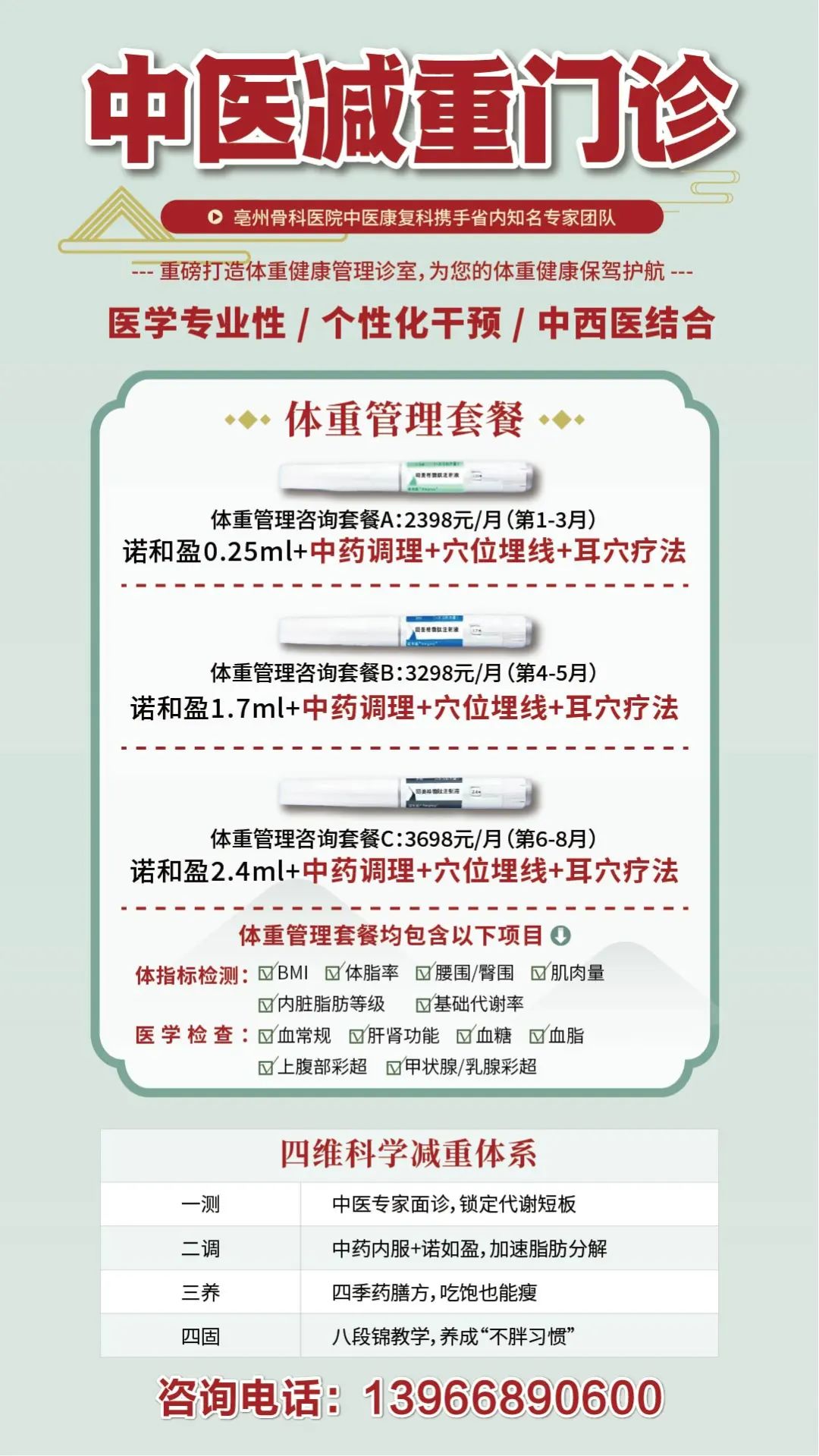 我院全新推出“诺和盈+中药调理+穴位埋线+耳穴疗法”四位一体体重管理套餐,从基础健康筛查到精准干预,帮助您高效、安全地实现瘦身目标。