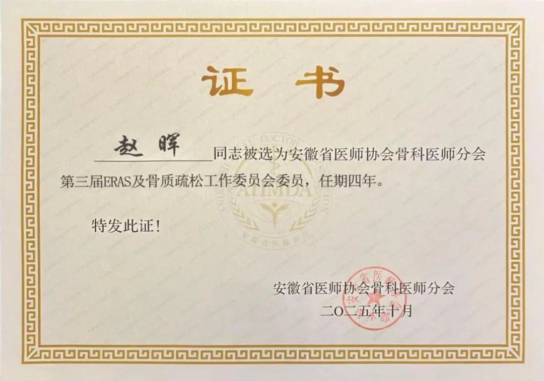 赵晖业务院长 荣任 安徽省医师协会骨科医师分会第三届ERAS及骨质疏松工作委员会委员;