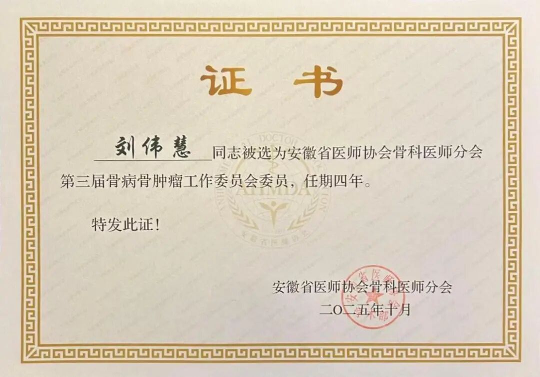 刘伟慧主任 荣任 安徽省医师协会骨科医师分会第三届骨病骨肿瘤工作委员会委员;