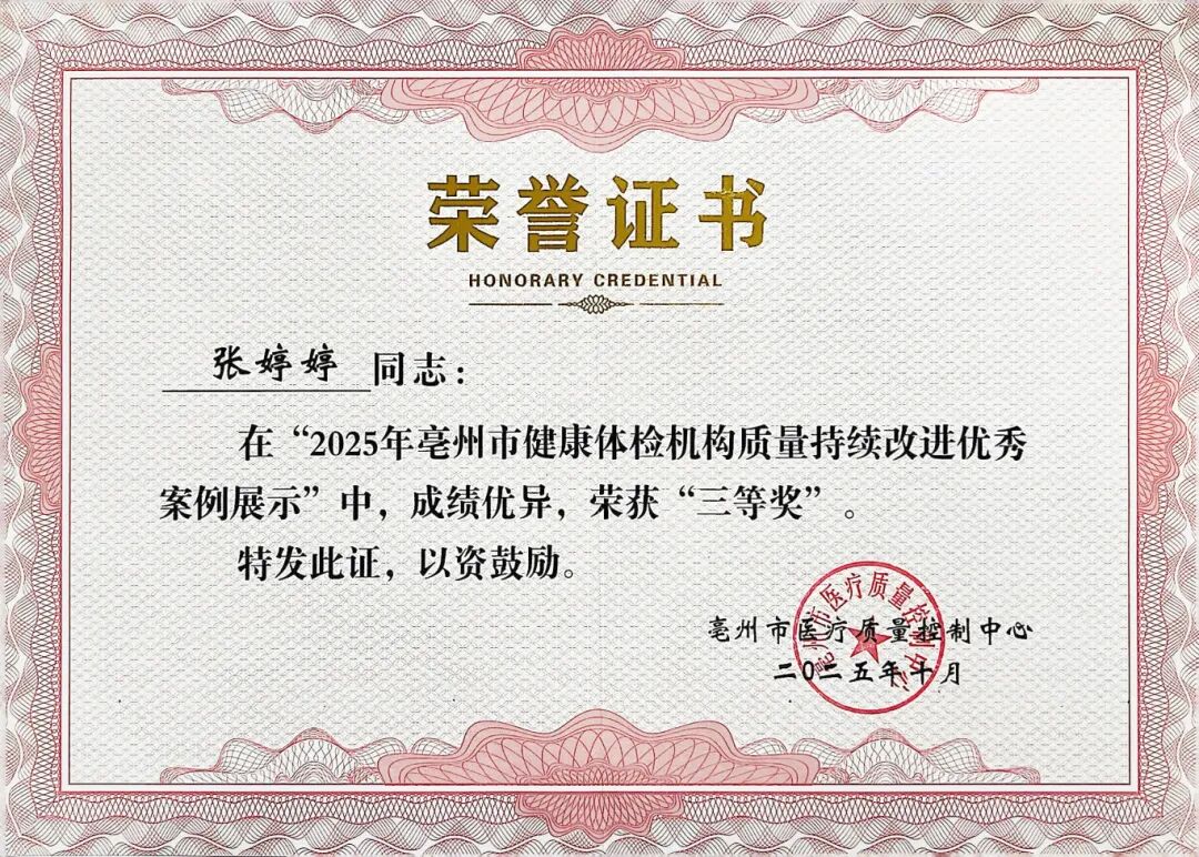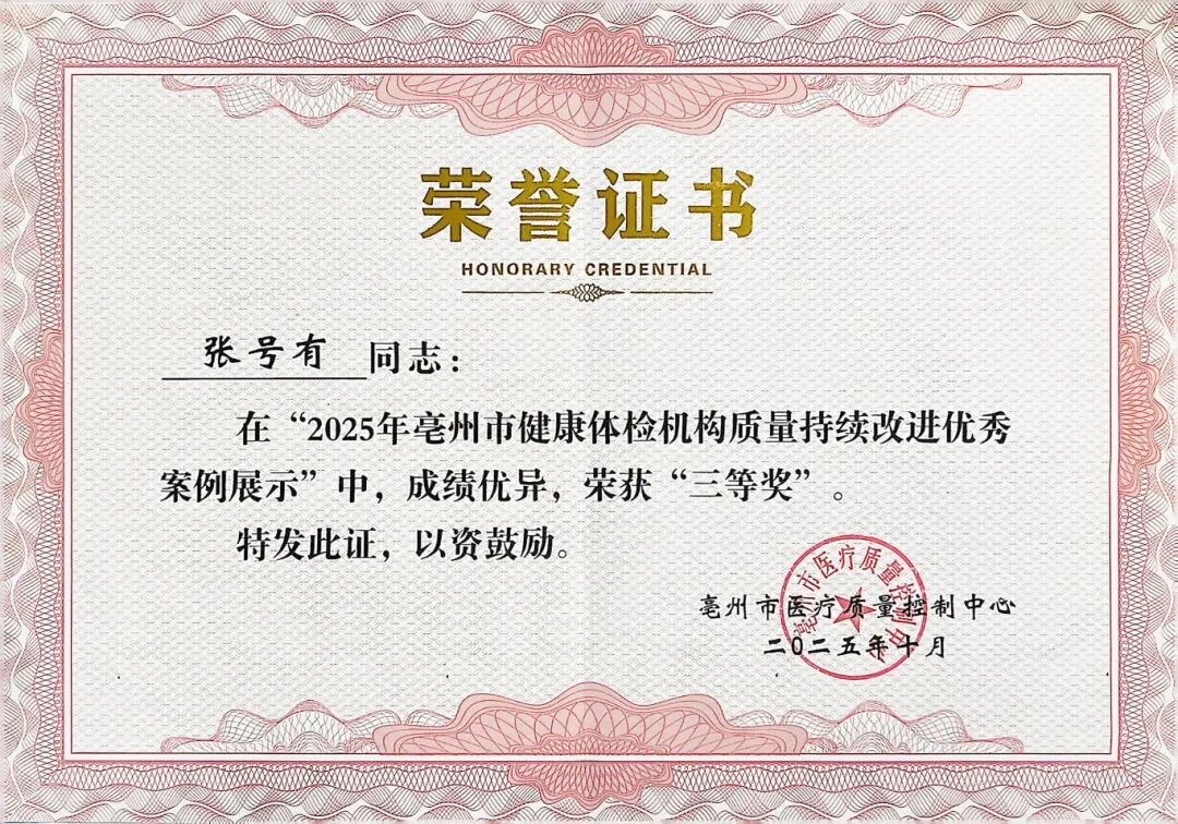 十月,在“2025年亳州市健康体检机构质量持续改进优秀案例展示”活动中,我院体检中心的张号有、张婷婷两位同事以过硬专业、细致服务、优秀表现,荣获市级“三等奖”荣誉。