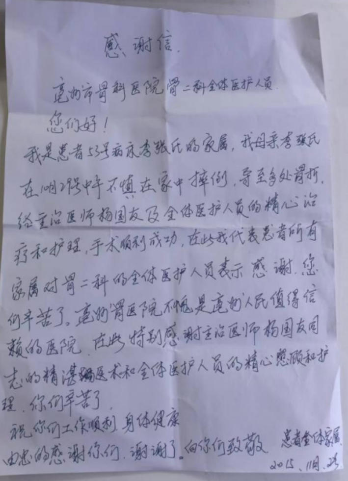 家属的信任与托付,是我们前行的动力。为表达感谢,11月他们特意送来锦旗与感谢信。这面锦旗,不仅承载着患者家庭的认可,更激励着我们始终以精湛技术与人文关怀,守护每一位患者的健康。