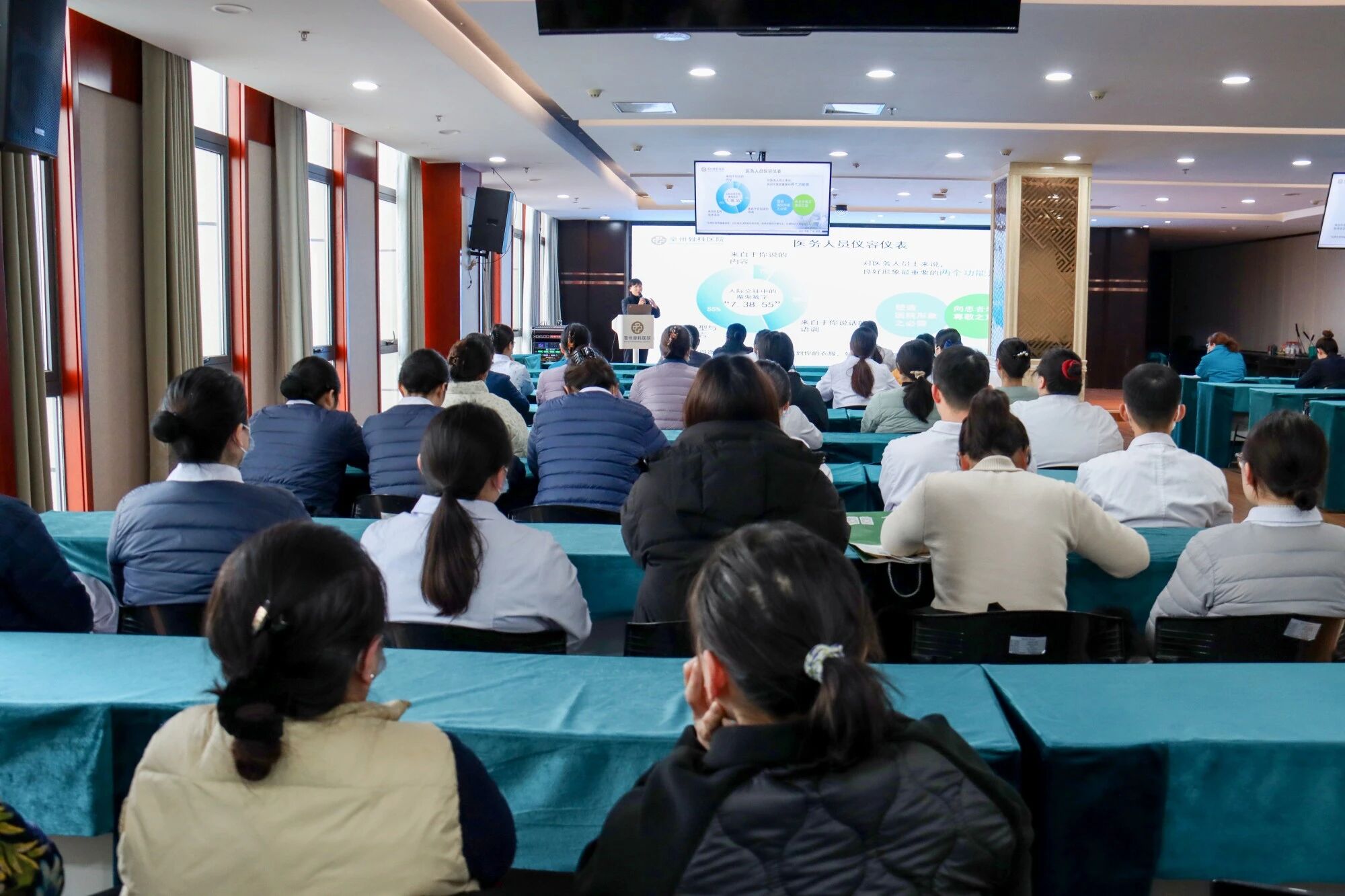 培训伊始,护理部李俊主任围绕医疗窗口服务礼仪进行理论讲解,从仪容仪表、站姿坐姿、文明用语,到与患者沟通中的细节规范,结合日常工作中的真实场景,深入浅出地进行了系统梳理。