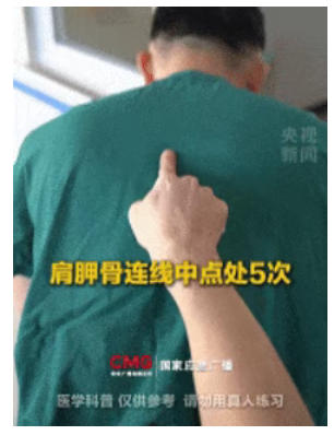 用掌根拍击肩胛骨连线中点5次