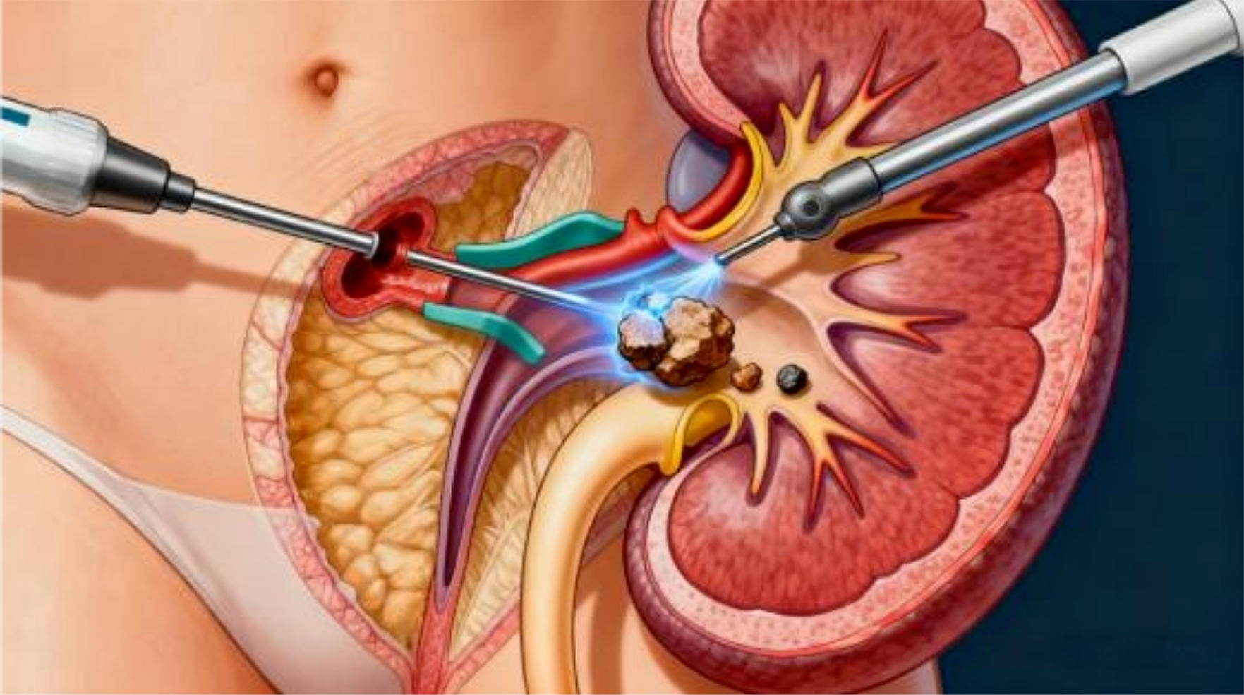 ④经皮肾镜取石术(PCNL):适用于>2cm的肾结石,在腰部建立一个微小通道,将肾镜插入肾脏,直接击碎结石并取出。