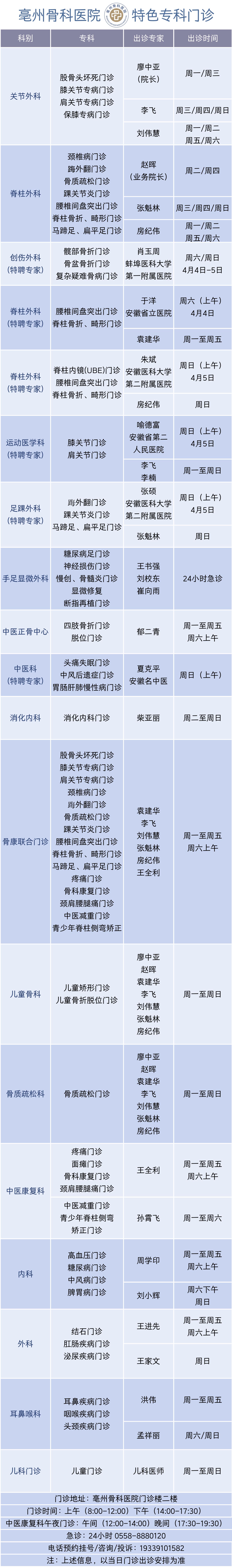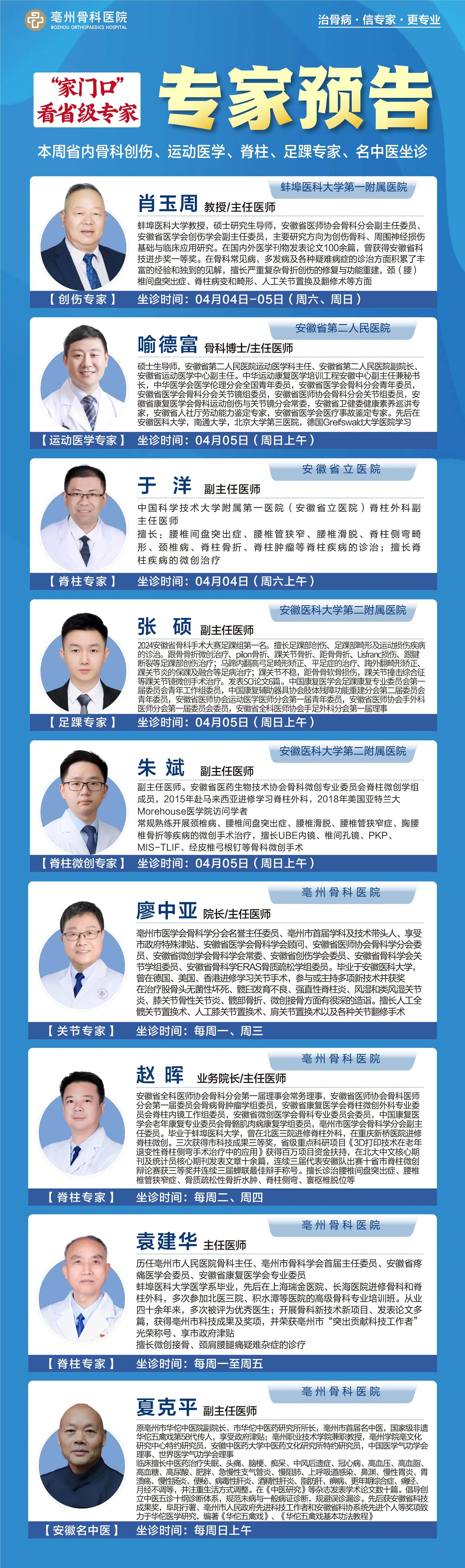 清明将至,为方便广大患者就近就医、少跑路,我院在节日期间正常开诊、不停诊。同时,特邀多位省级知名专家来院坐诊,开展特色专病门诊服务,让您在家门口即可享受高水平诊疗资源。无论是常见骨科问题,还是疑难复杂疾病,都可得到专业、精准的诊疗支持。