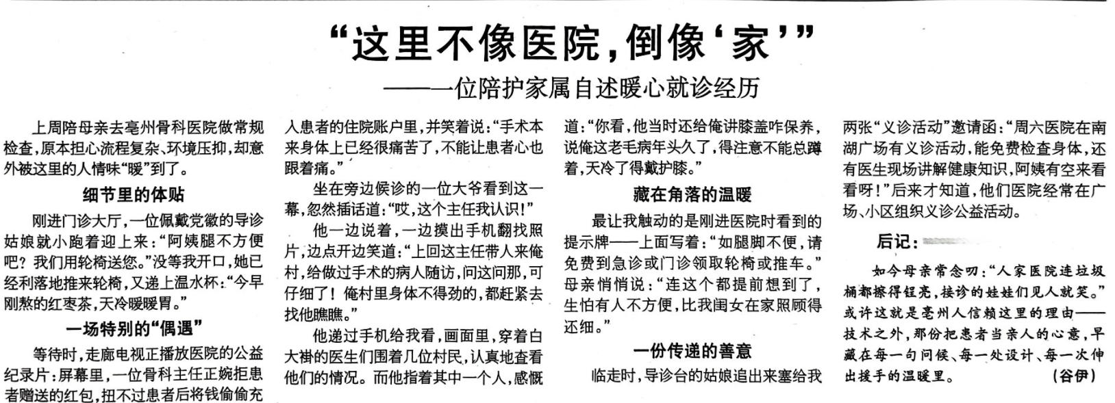 近日,一篇来自《亳州晚报》的暖心报道,让亳州骨科医院的医者仁心与人文温度,被更多人看见与传颂。一位陪护家属以亲身经历,写下了在我院就诊时被细节温暖、被善意打动的真实故事,字里行间满是 “这里不像医院,倒像‘家’” 的由衷赞叹。今天,我们将这篇温暖的自述全文分享,一同感受藏在诊疗之外、刻在服务细节里的医者初心。